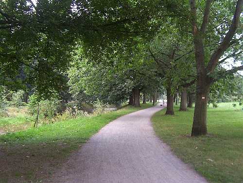 bis hin zu Pfälzerwald und Vogesen, sowie zum Nordschwarzwald. Am Schützenhaus gehen wir noch vorbei in Richtung Turmberg, biegen jedoch kurz nach der Gaststätte links ab und queren die "Jean-Ritzert-Straße" und wandern durch einen ein nur für Anlieger bestimmten Weg nach links zwischen Gärten bergab. Rasch erreichen wir die Bebauung von Durlach und gehen geradewegs durch die Straße "Im Zeitvogel" bergab. An ihrem Ende gehen wir rechts und weiter unten, kurz bevor wir auf die "Rittnertstraße" kommen, können wir über ein paar Stufen zur Bushaltestelle "Lerchenberg" abkürzen, überqueren hier die Rittnertstraße und gehen die Straße "Am Lerchenberg" wieder bergauf. Ihr folgen wir bis zum Ende, schwenken dann links "Im Rosengärtle" ein und gehen kurz nach dem "Elli-Heuss-Weg" nach rechts in eine Anliegerstraße, gleich danach halten wir uns links und genießen den schönen Blick auf Durlach und Karlsruhe und die Berge des Pfälzerwaldes und der Nordvogesen. Nach einigen Minuten rechts "Im Pfistergrund", bis wir zur "Bergwaldstraße" im Wohngebiet Geigersberg kommen. Wir gehen links in den "Hohenwettersbacher Weg" und durch einen Hohlweg in den Wald. Hier begleitet uns nun ein Stück der Saumweg des Schwarzwaldvereins. Beim Wanderparkplatz gehen wir vorbei an der Tafel der "Waldwelt" auf dem rechten der beiden Wege. Unser Teerweg dreht nach einer Weile nach rechts ab. Hier sehen wir das "Ergebnis einer sürmischen Weihnacht mit verheerenden Folgen", also das was Orkan Lothar am 26. Dezember 1999 hinterlassen hat. Wir passieren einen Brunnen, halten uns danach rechts und gehen 300 Meter nach der Kurve weiter links über eine Kuppe am Dammwildgehege entlang und beim Spielplatz geradeaus, queren nochmals den Teerweg, um wenig später nach rechts bergab zu wandern. Unten dann links, nach 100 Metern scharf rechts und wenig später abermals links über ein paar Stufen steil hinab und anschließend weiter durch einen kleinen Hohlweg. Unten queren wir den Tiefentalgraben und kommen danach zur Tiefentalstraße, wo wir gleich die Straßenseite wechseln. Am Waldrand kommt übrigens von links aus dem Wald ein mit der "gelben Raute" markierter Wanderweg des neuen Wegekonzepts des Schwarzwaldvereins hinzu. Er wird uns bis zum Schloß Rüppurr begleiten. Wir wandern bis zur großen ampelgeregelten Kreuzung beim Zündhütle und queren die B 3, gehen dann links an den Gleisen der im Juni 2004 eröffneten Straßenbahn entlang zu ihrer Endstation Wolfartsweier-Nord, kommen dann nochmals kurz an die B 3, schwenken aber gleich nach rechts in die "Ringstraße" ein. Schon nach wenigen Metern bringt uns ein Fußweg nach rechts in die Felder. Gleich links, zunächst hinter den Häusern, dann aber geradeaus in die Feldfur, halten wir uns nach etwa 5 Minuten links und kommen an den Hansengraben und gehen hier rechts und weiter in Richtung Autobahn, deren Verkehrslärm wir inzwischen längst hören. Schauen wir zurück, sehen wir über die Felder und Gärten den Turmberg und den grauen Turm des Zündhütle. Unter der neuen Umgehungsstraße hindurch gelangen wir zum Oberwaldstadion und orientieren uns linkshaltend auch den Schildern des Schwarzwald-Radweges folgend weiterhin am Graben entlang. Nun geht es unter der Autobahn hindurch geradewegs in den Oberwald. Am Ende des Weges wandern wir links und kommen rasch an einen Zaun, geradewegs führt ein Fußweg in 100 Metern zum Erlachsee. Unsere Markierung bleibt auf dem geteerten Holderweg und führt also nach rechts. Nach Queren eines Grabens, der aber meist trocken ist führt rechts ein Weg zum Tierpark. Wir aber wandern geradeaus, kreuzen wenig später den "Richard-Massinger-Weg" des Schwarzwaldvereins von Karlsruhe zum Mahlberg. Wir bleiben noch für 300 Meter auf dem Holderweg, gehen dann auf dem zweiten Weg nach rechts und kommen rasch an den Waldrand, an dem wir bleiben, auch wenn er bald nach links abknickt. Vorbei am Wohnstift kommen wir nach wenigen Minuten an eine große Straße, die wir an der Fußgängerampel überqueren. Wir haben die Haltestelle "Schloß Rüppurr" der Albtalbahn erreicht. Nach den Gleisen orientieren wir uns zunachst nach links bis dorthin, wo die Straße umknickt und ein Wegweiser des Schwarzwaldvereins hängt. Ab hier wird uns bis zur Appenmühle der mit einer blauen Raute markierte "Albtalweg" begleiten. Die Alb ist das Flüßchen, das durch Karlsruhe fließt. Sie entspringt im Nordschwarzwald, genauer im oberen Gaistal bei Bad Herrenalb und mündet einige Kilometer nördlich von Karlsruhe in den Rhein.